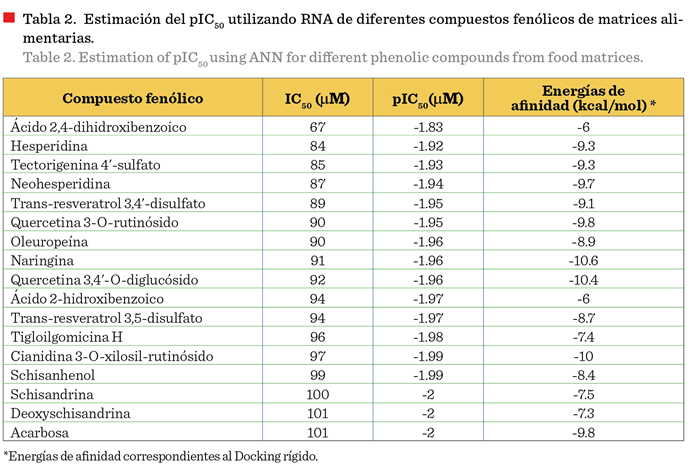 compuestos fenólicos encontrados en matrices alimentarias (CF-MA). La RNA se
