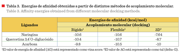 3,4'-O-diglucósido diglucósido (-1.96) presentaron mayor energía libre de afinidad (-10.6 kcal/mol y -10.4 kcal/mol, respectivamente)